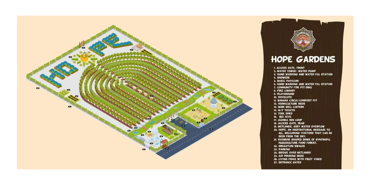 Hope Gardens (Suon Sangkhum) are fast growing food forests that produce perennial sustainable fruits, nuts, vegetables, medicinal herbs, and proteins that aim to help end hunger as well as provide balanced nutrition for healthy holistic life and growth. Hope Gardens also include a water well and tower water system to provide clean water. Free hand washing stations and public showers promote cleaner living conditions that will also help prevent illness and disease. Living fruit fencing invites the community into the shared space to help encourage community gatherings. Dovecotes (man-made shelters for pigeons) help to provide essential proteins necessary for healthy growth and life. Free public showers promote cleaner living conditions that help prevent illness and disease. Wind Turbines on the water towers allow for use of lights at night, electrical equipment, and charging phones. Free libraries encourage learning with a unique learn-at-your-own pace education system. An inter-community seed and tool share network will ensure the ability for the communal creation and upkeep for the Suon Sangkhum. Each Hope Park include a playground and pavilion to provide a safe community place for children to play and adults to gather.